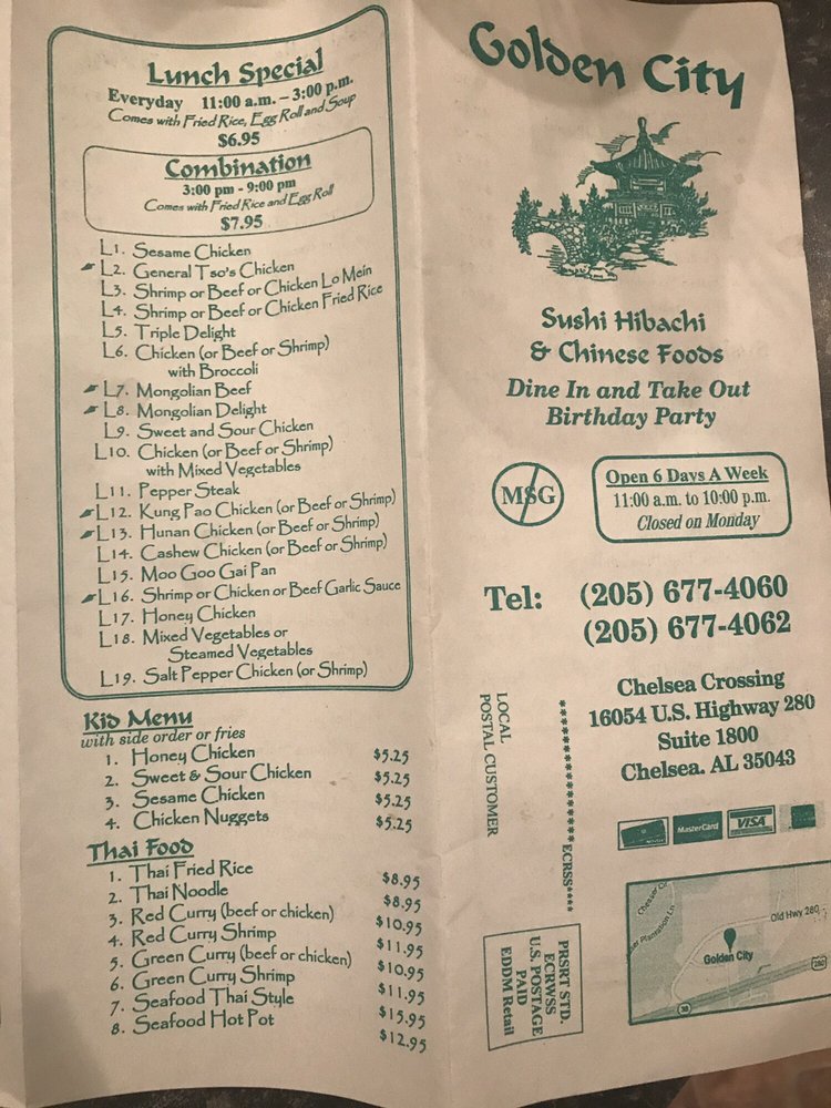 Nestled in Chelsea, Alabama, Golden City delights with authentic Chinese cuisine and a welcoming atmosphere. Their menu is a treasure trove of flavors, featuring chicken dishes such as Almond Chicken, Hunan Chicken, and the customer-favorite General Tso's Chicken, infused with spice and freshness. The restaurant's commitment to quality ensures each dish is prepared to order, guaranteeing that every bite delights the palate.